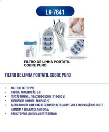 Filtro de linha portatil cobre puro 2m pvc 10a 2200-2500w (110-250v)