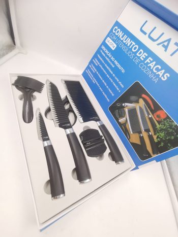 Conjunto Kit faca Preta 6 itens Inox Mármore Para cozinha Churrasco Descascador de Legumes
